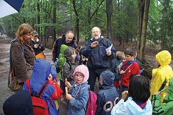 | Op de foto: kinderen in het bos luisteen naar activist/bioloog Henk Kuiper (met baard) |