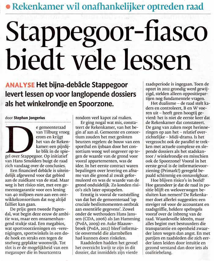 In juli 2015 heeft de Rekenkamer het rapport uitgebracht "Voor eigen rekening en risico", naar de totstandkoming en uitvoering van de overeenkomsten tussen de gemeente en het Consortium Stappegoor B.V. In dit rapport wordt onder meer geconcludeerd dat de informatievoorziening aan de raad onvoldoende adequaat was en dat grote delen van het besluitvormingsproces zijn gedomineerd door een politieke realiteit. De beschikbare informatie wordt, aldus de Rekenkamer, door de raad ook niet altijd optimaal ingezet is ten bate van zijn kaderstellende en controlerende functie. De Rekenkamer pleit er in zijn rapport voor om juist bij grote projecten die betrekking hebben op publieke en private samenwerking nadrukkelijk(er) en bewust(er) invulling te geven aan het dualisme. De Rekenkamer roept op om meer onafhankelijkheid te organiseren en te borgen (evenwicht en tegenwicht) in de besluitvormingsprocessen.